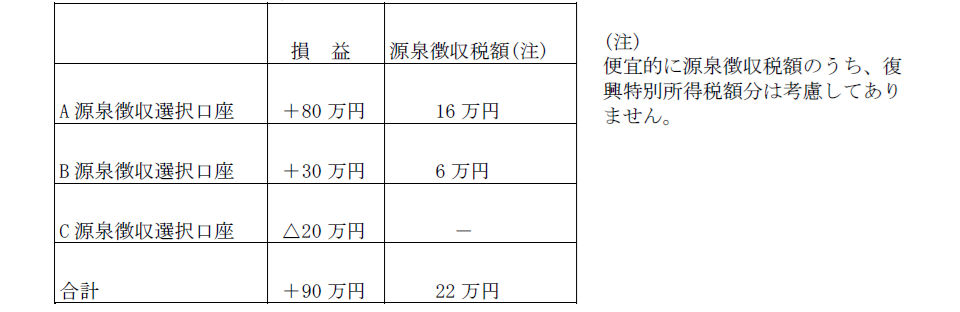 (2) あなたの場合、A~Cすべての口座を通算すると、合計所得金額は90万円増加し、譲渡益に対する納付税額は、90万円×20%=18万円となりますが、22万円が既に源泉徴収されているため、4万円の還付を受けることができます。なお、B特定口座の利益とC特定口座の損失のみを通算して申告(合計所得金額は10万円増加)することも可能です。この場合、納付税額は10万円×20%=2万円となりますが、6万円が既に源泉徴収されていることになりますので、この場合も4万円の還付を受けることができます。還付額は同額ですが、合計所得金額の増加額に違いがあることに注意して下さい。